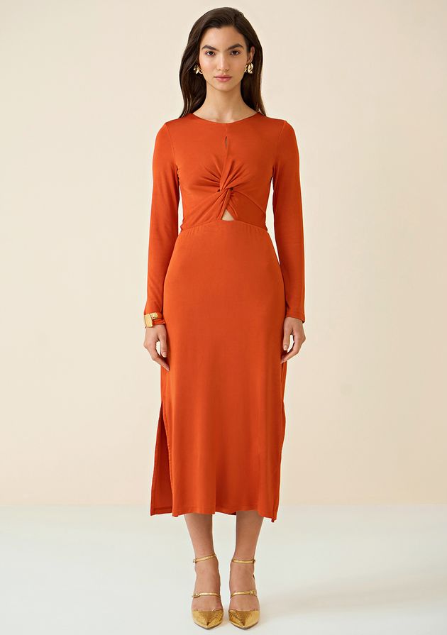 Vestido Maria.Valentina Midi Decote Redondo Torção Frente Laranja