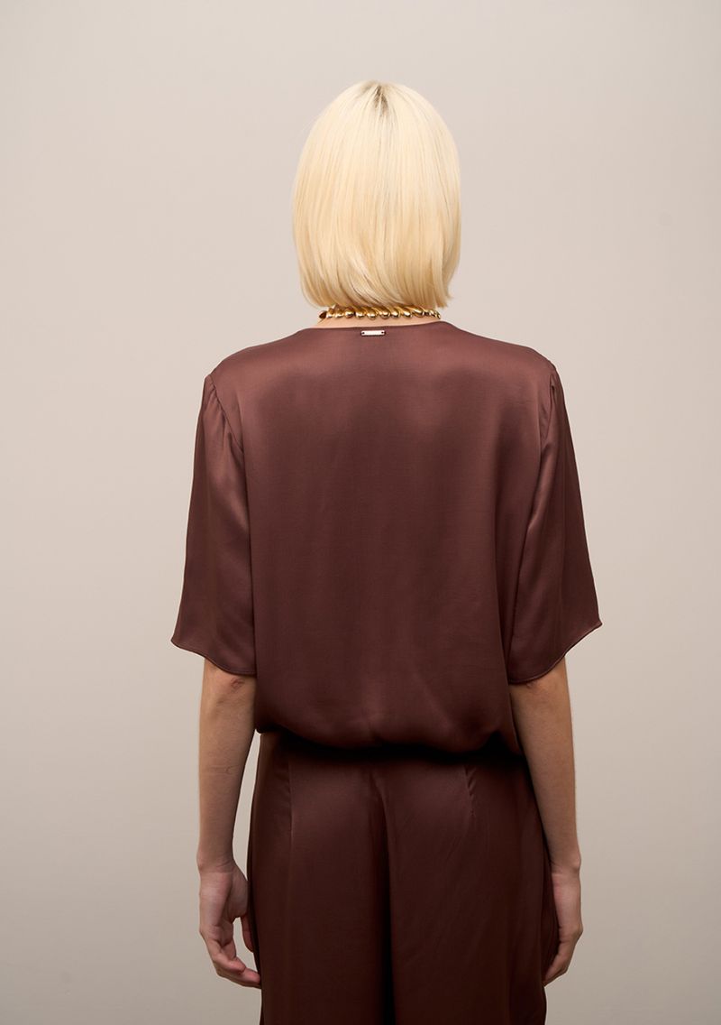 Blusa Iódice Solta Decote Transpassado Manga 3 Quartos Padrão Marrom