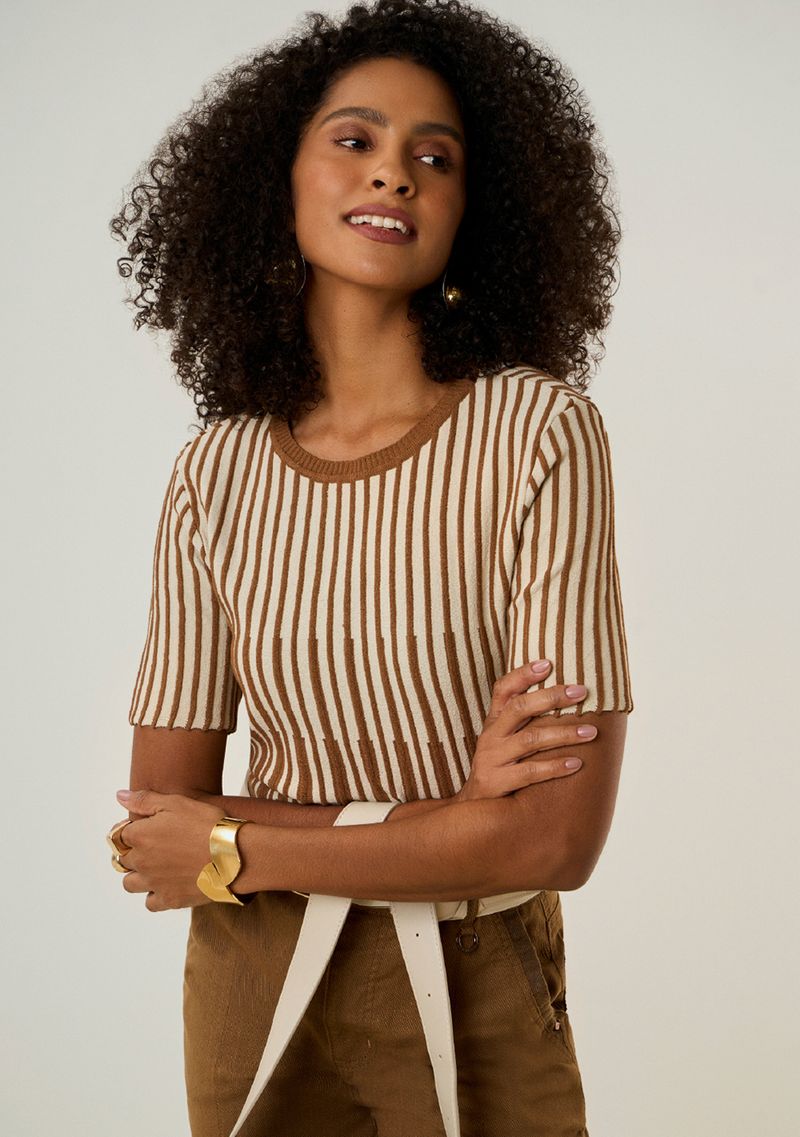 Blusa Maria.Valentina Ajustada Decote Careca Manga Curta Padrão Marrom