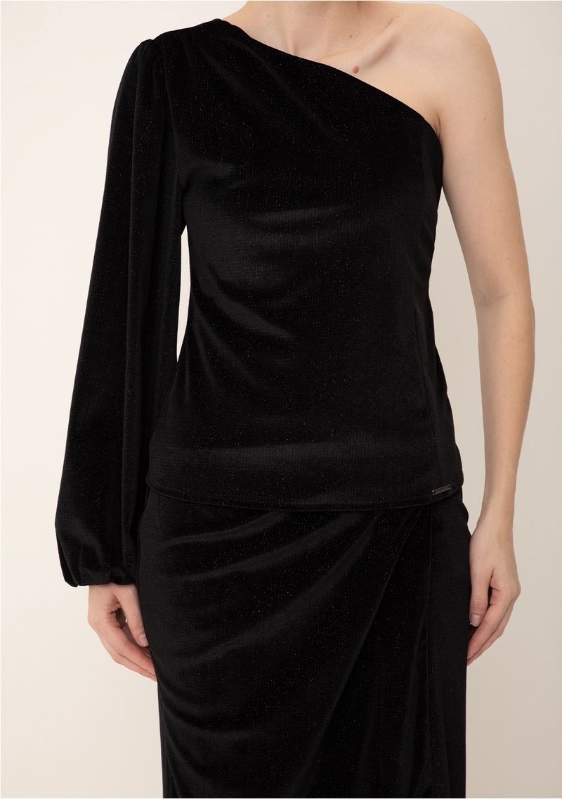 Blusa Maria.Valentina Ajustada Um Ombro Só Manga Longa Padrão Preto