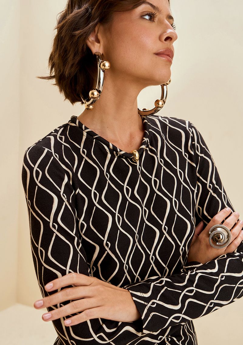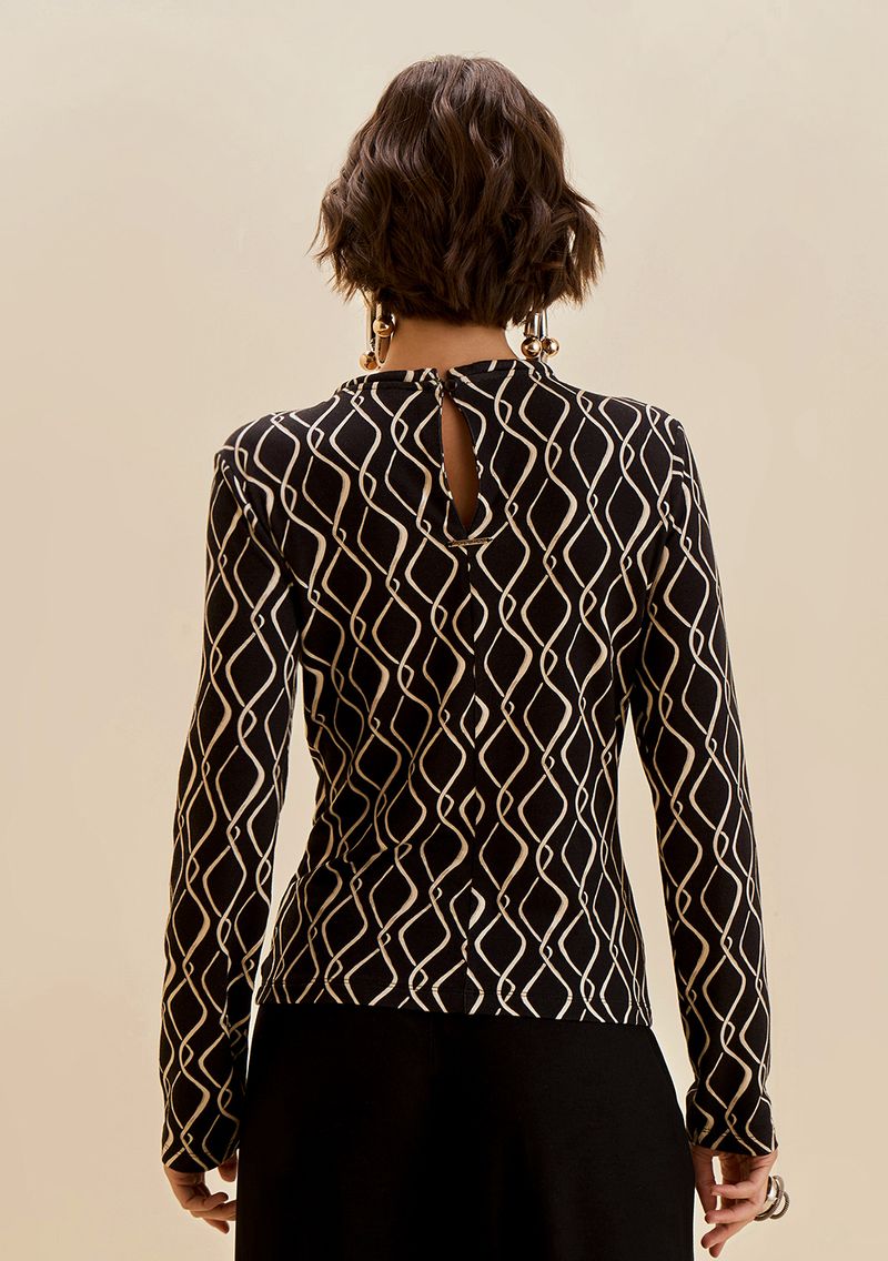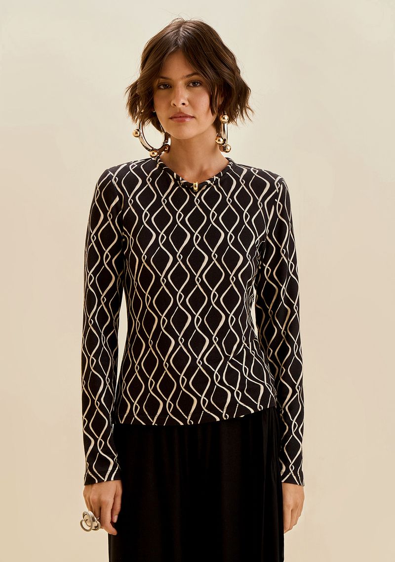 Blusa Morena Rosa Ajustada Decote Careca Manga Longa Padrão Preto