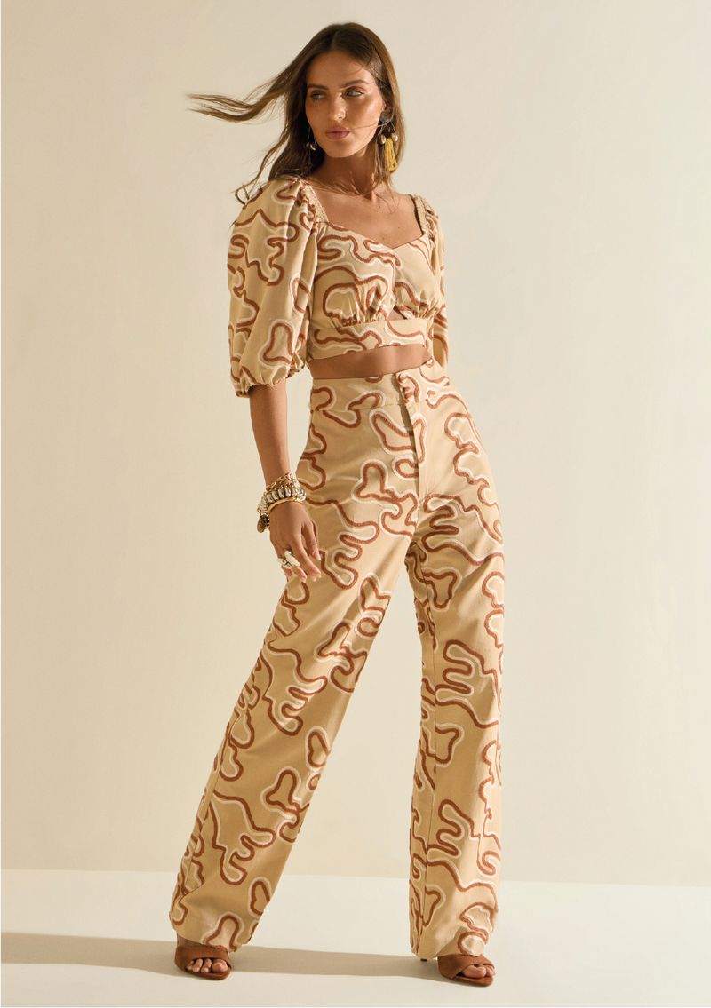 Blusa Morena Rosa Ajustada Decote V Manga Longa Cropped Bege