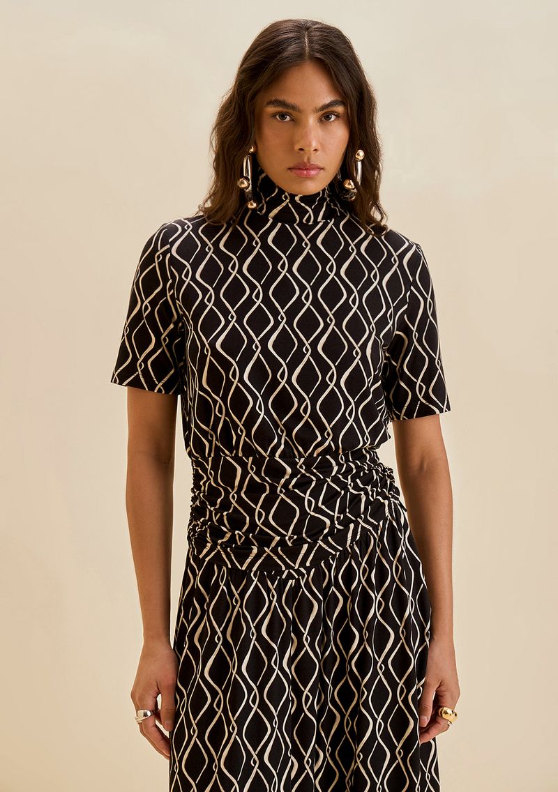 A Blusa Morena Rosa Ajustada Gola Alta Manga Curta Padrão Preto é a definição de sofisticação e versatilidade. Com um design ajustado que valoriza suas curvas, essa peça é confeccionada em tecido de alta qualidade, garantindo conforto e elegância. A gola alta e as mangas curtas trazem um toque moderno e refinado, ideal para transitar entre o trabalho e eventos sociais. Combine-a com saias midi ou calças de alfaiataria para um look chic, ou aposte em jeans para um visual descontraído. Parte da coleção inspirada em estampas étnicas e cultura boêmia, esta blusa celebra o charme brasileiro. Descubra o poder de se sentir confiante e inesquecível com Morena Rosa.