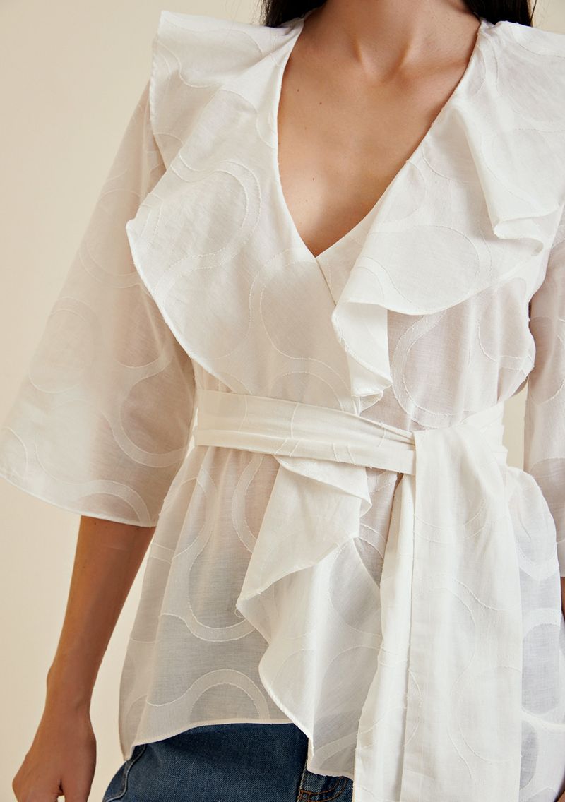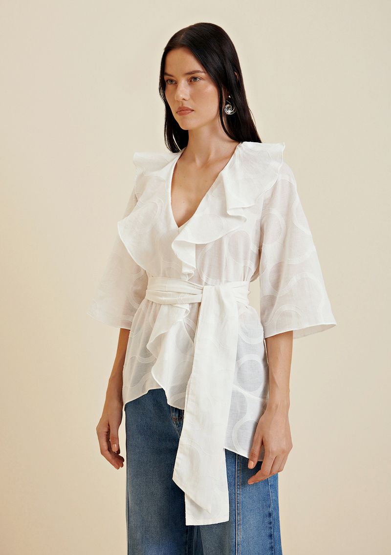 Blusa Morena Rosa Decote V Manga Curta Com Babado Off White