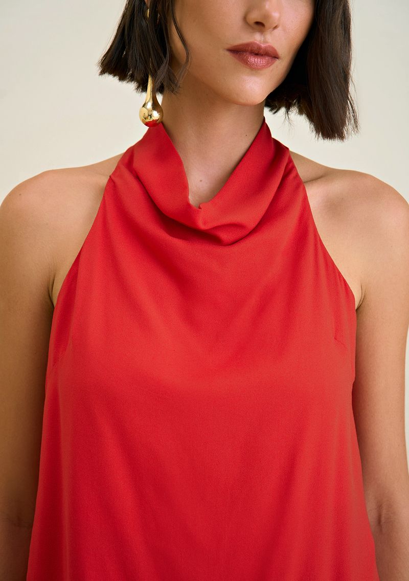 Blusa Morena Rosa Gola Alta Sem Manga Abertura Costas Vermelho