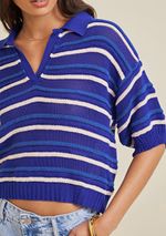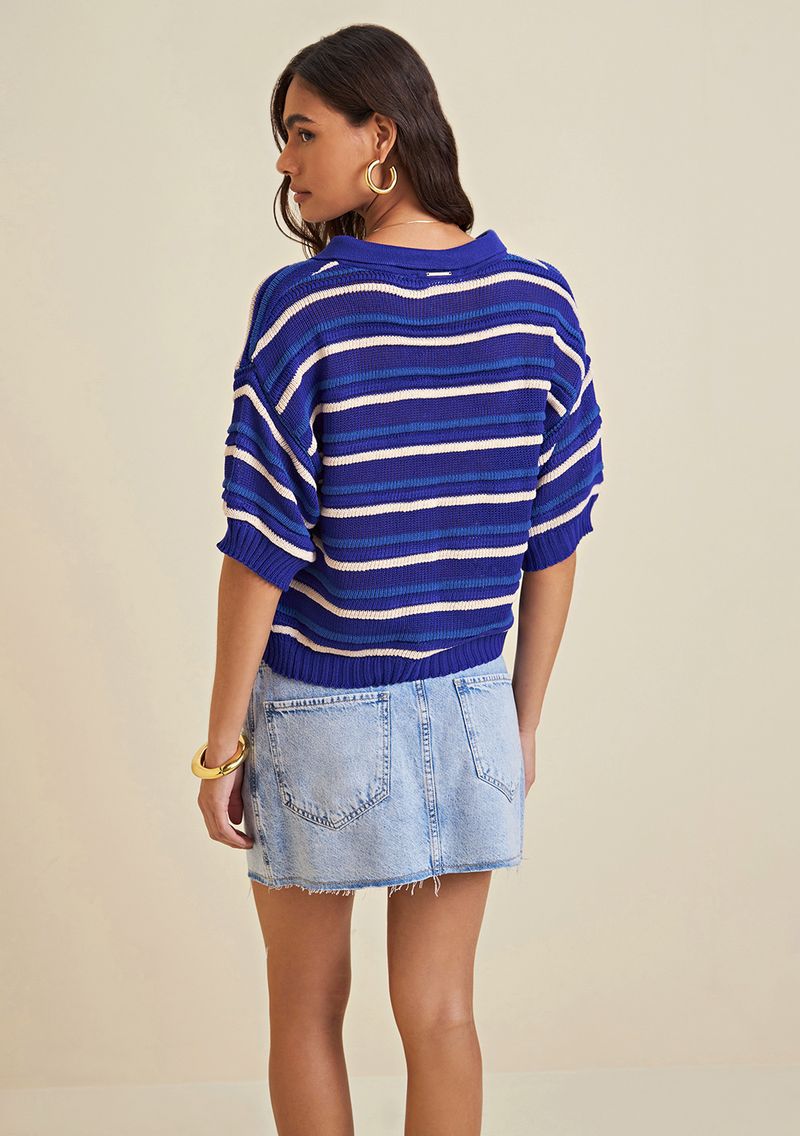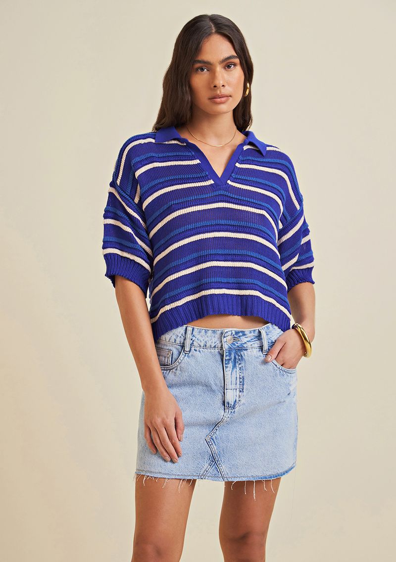 Blusa Morena Rosa Gola Polo Manga Curta Tricot Azul