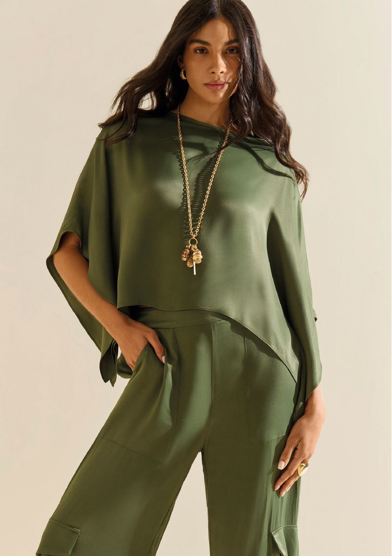 Blusa Morena Rosa Solta Decote Canoa Manga Curta Padrão Verde