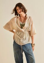 Blusa Morena Rosa Solta Decote Transpassado Manga 7 Oitavos Padrão Bege