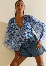 Blusa Morena Rosa Solta Decote V Manga 7 Oitavos Padrão Azul