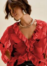 Blusa Morena Rosa Solta Decote V Manga 7 Oitavos Padrão Vermelho