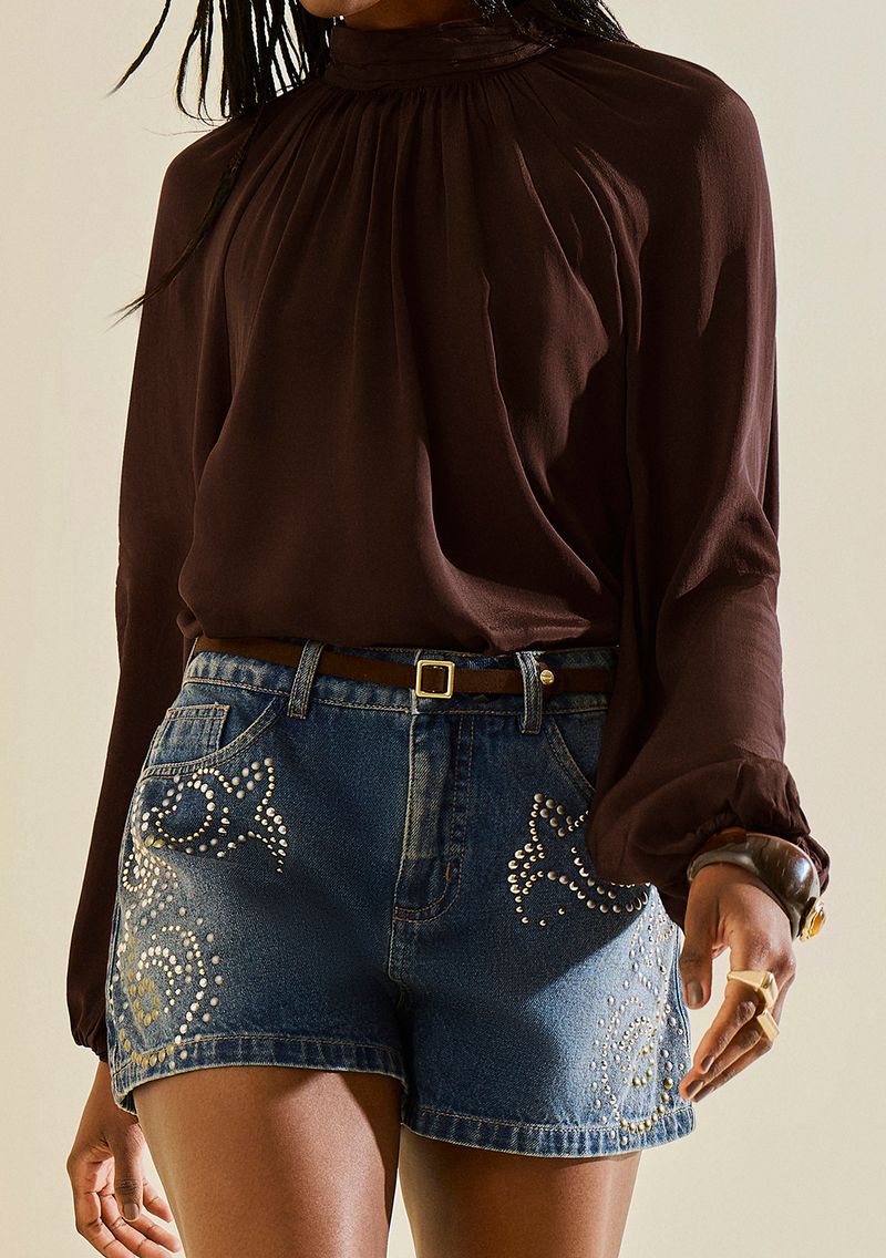 Blusa Morena Rosa Solta Gola Alta Manga Longa Padrão Marrom