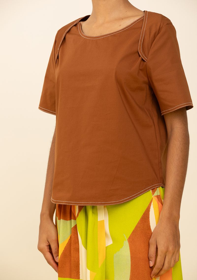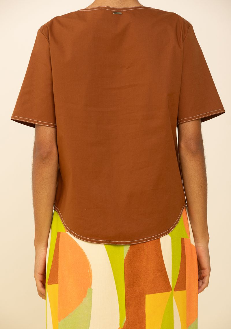Blusa Zinco Solta Decote Canoa Manga Curta Padrão Marrom