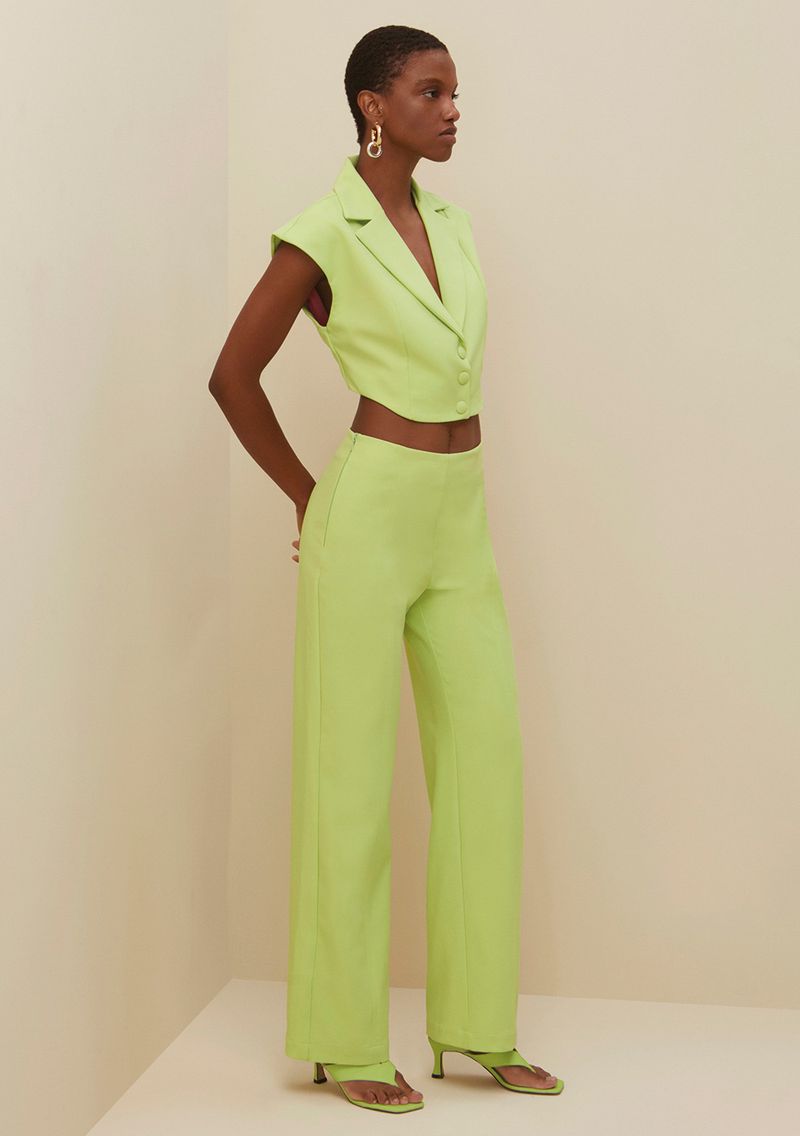 Calca Morena Rosa Reta Alfaiataria Cós Alto Detalhe Contraste Verde Claro