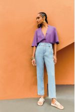 Calça Zinco Mom Cós Alto Bolso Bordado Jeans