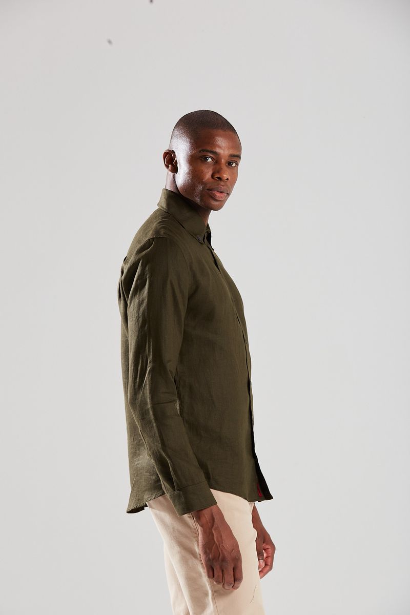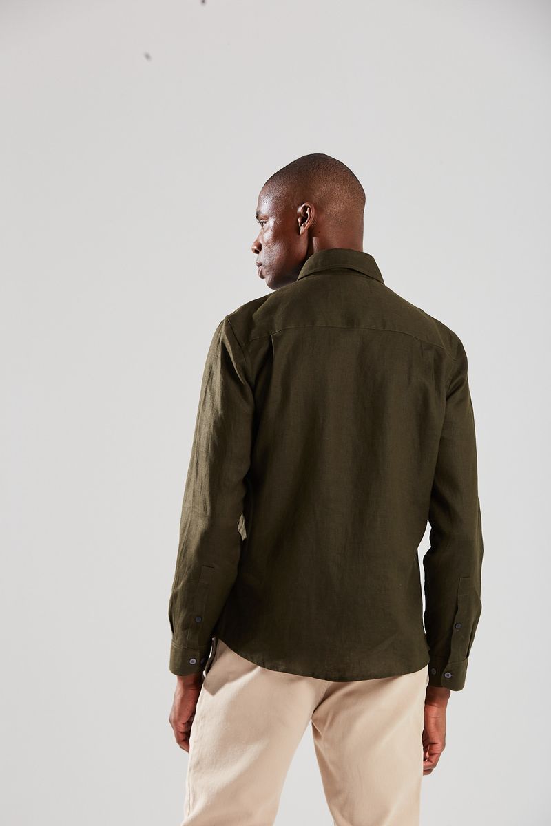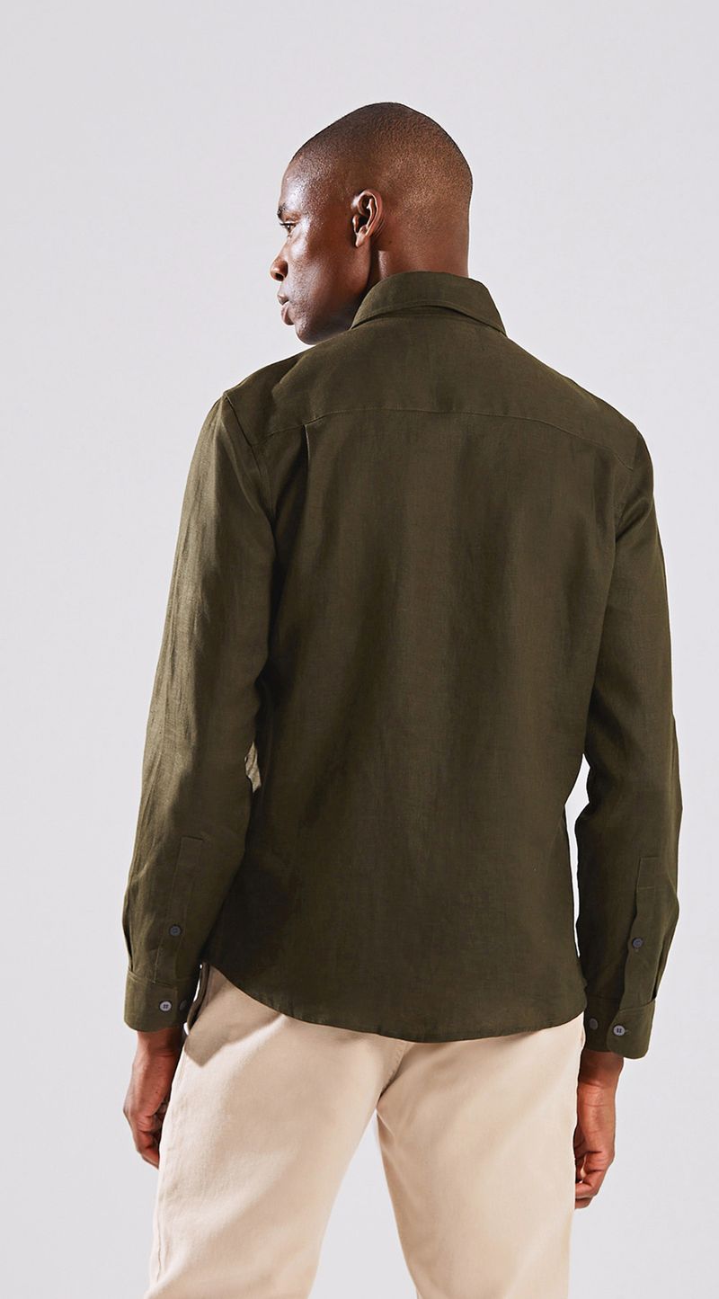 Camisa Manga Longa Com Bordado. A camisa verde militar em linho, é perfeita para um look masculino sófisticado. Os detalhes bordados e a manga longa adicionam um charme distintivo.