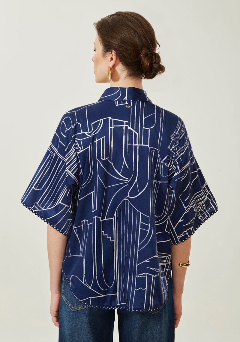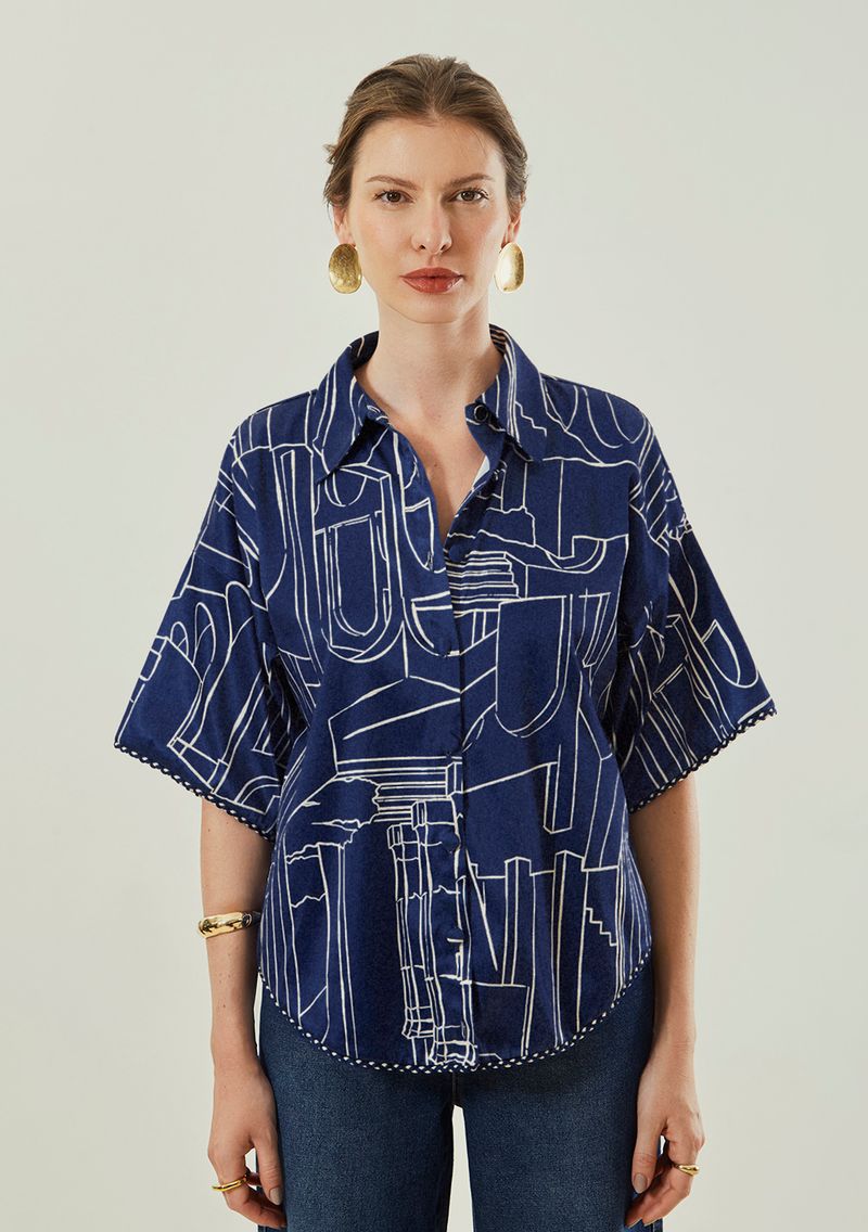 Camisa Maria.Valentina Solta Gola Clássica Manga Curta Padrão Azul