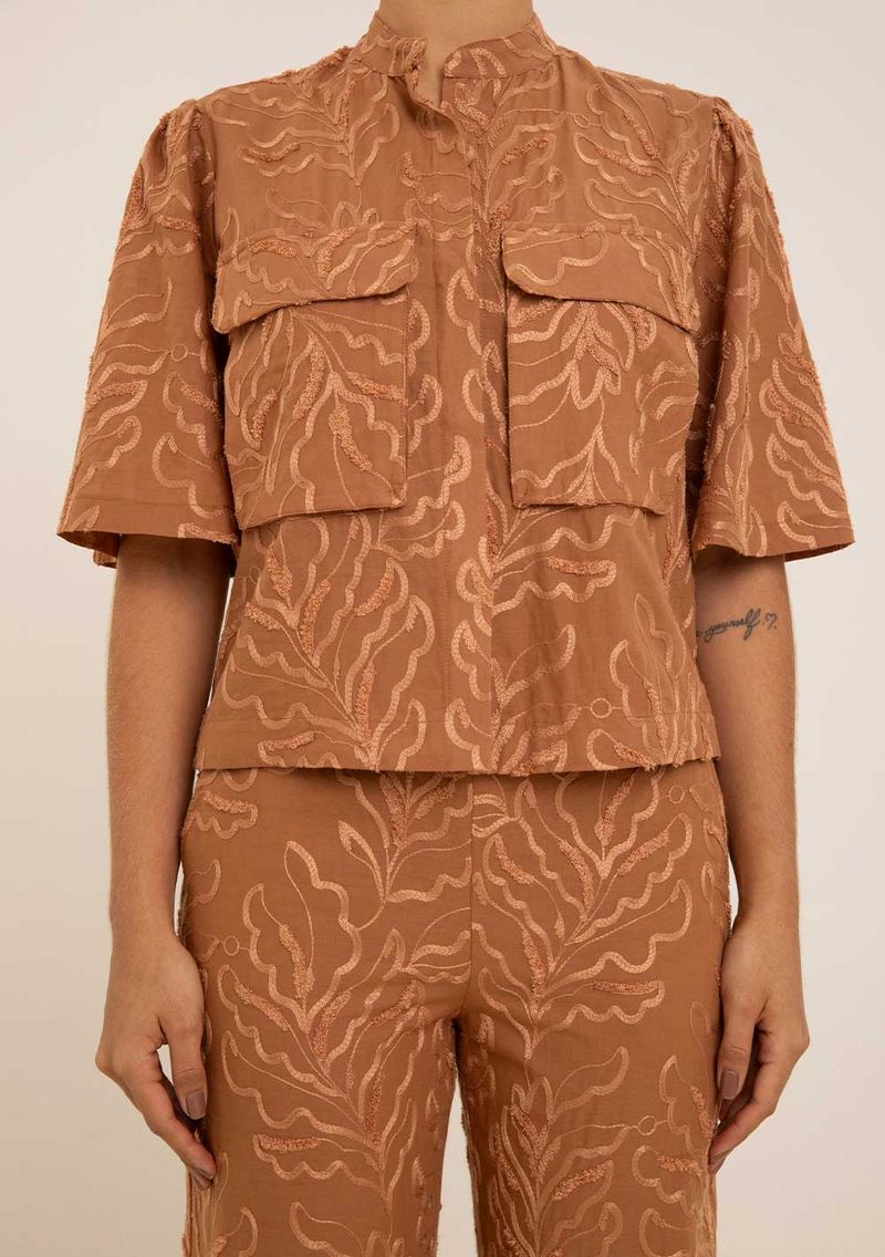 Camisa Maria.Valentina Solta Gola Padre Manga Longa Padrão Marrom