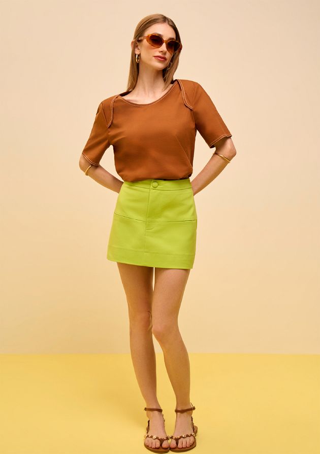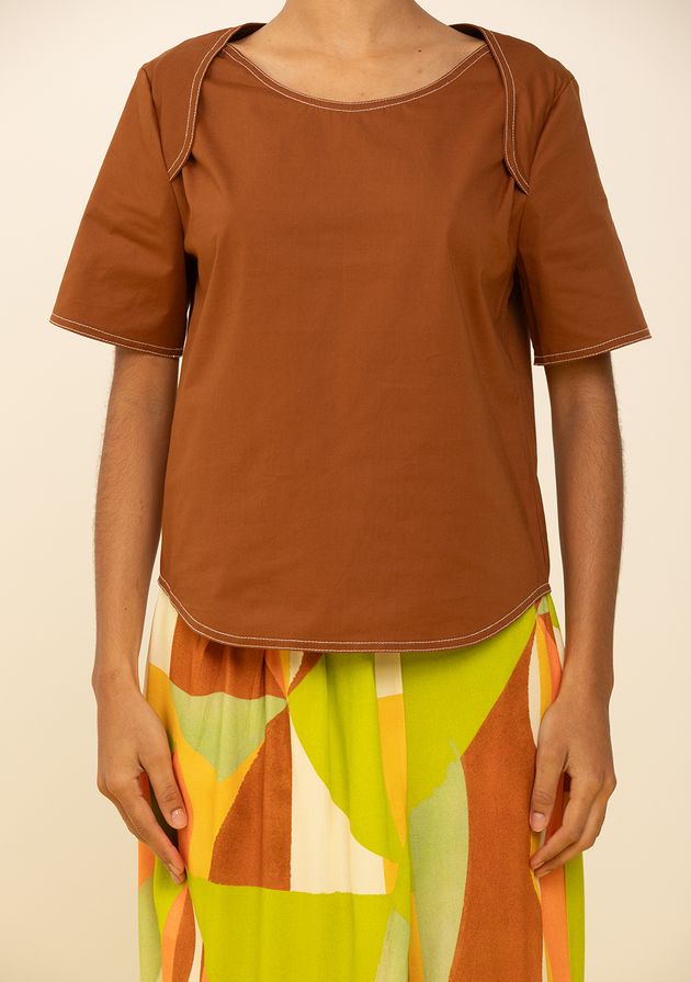 Blusa Zinco Solta Decote Canoa Manga Curta Padrão Marrom