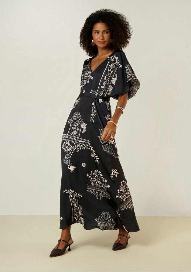 Vestido Maria.Valentina Ajustado Decote V Manga Curta Longo Preto