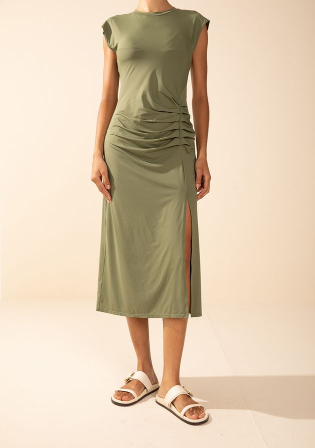 Vestido Morena Rosa Ajustado Decote Careca Sem Manga Midi Verde