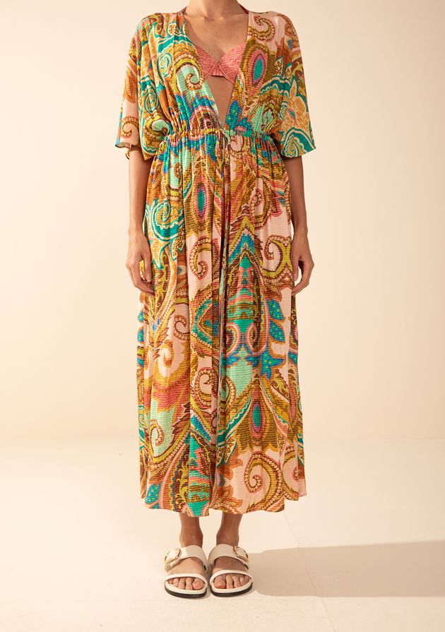 Vestido Morena Rosa Solto Decote V Manga Curta Curto Marrom