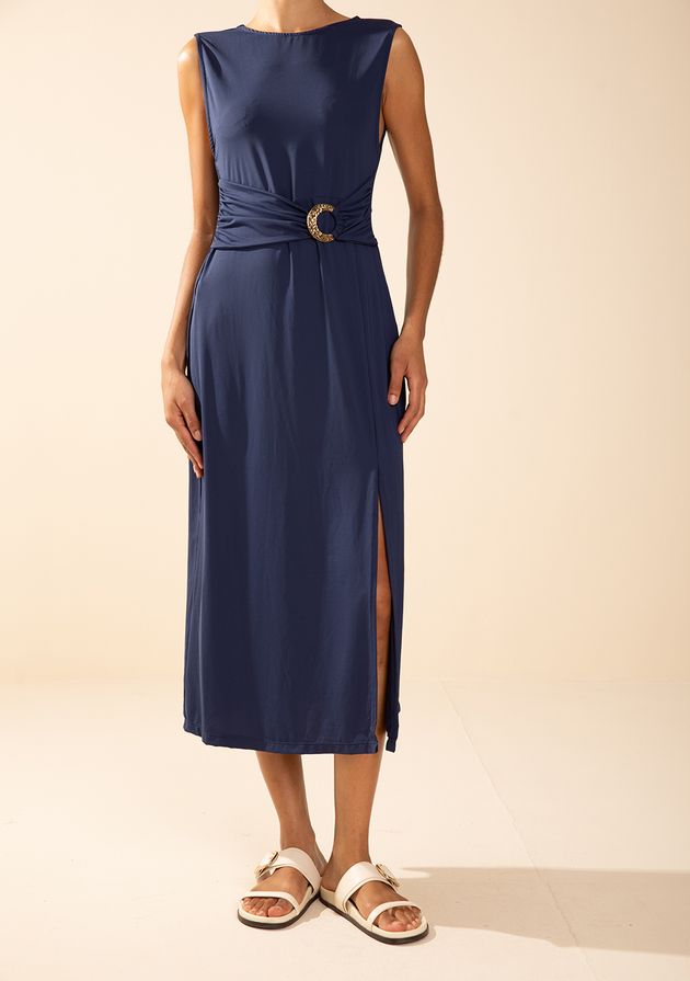 Vestido Morena Rosa Ajustado Decote Careca Sem Manga Midi Azul Escuro