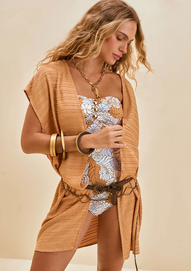 Vestido Morena Rosa Solto Decote V Manga Curta Curto Marrom