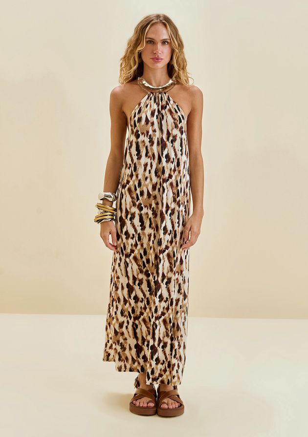 Vestido Morena Rosa Solto Cava Francesa Sem Manga Longo Marrom
