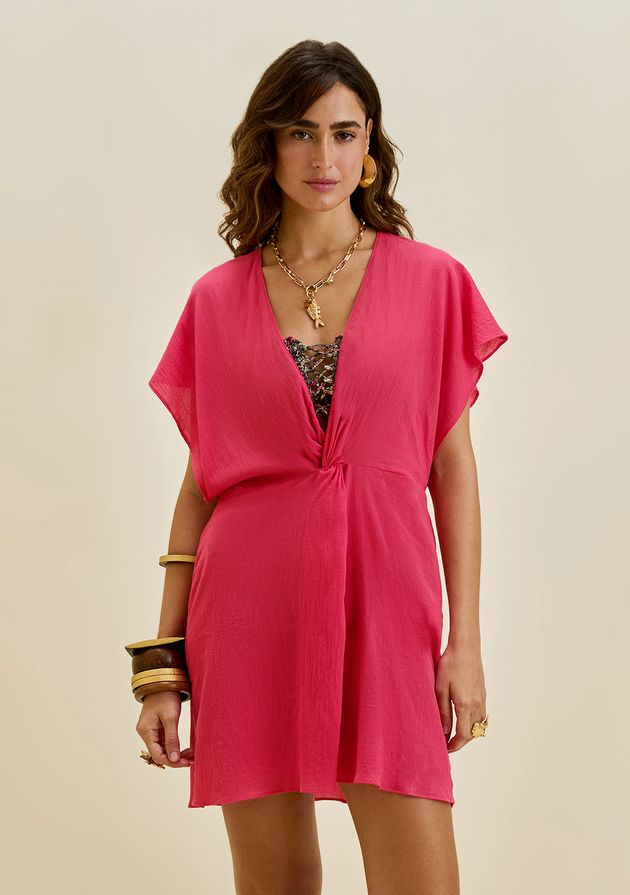 Vestido Morena Rosa Solto Decote V Manga Longa Curto Rosa