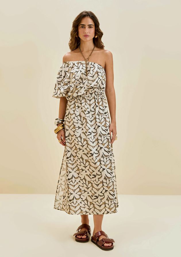 Vestido Morena Rosa Solto Um Ombro Só Manga Curta Midi Bege