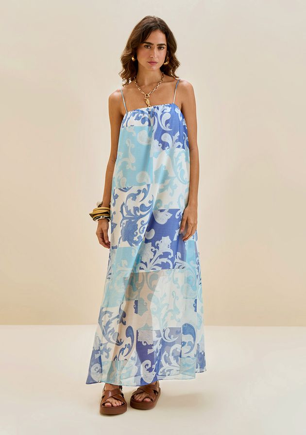 Vestido Morena Rosa Solto Decote Reto Com Alça Longo Azul