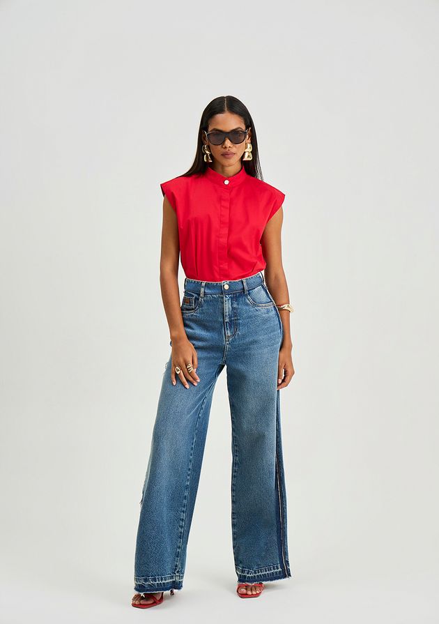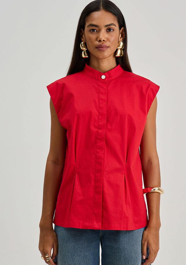 Camisa Iódice Solta Decote V Manga Curta Padrão Vermelho