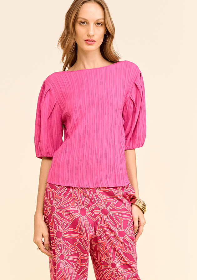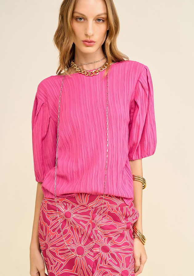 Blusa Zinco Solta Decote Careca Manga 3 Quartos Padrão Rosa