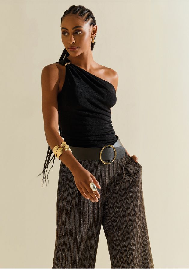 Regata Morena Rosa Ajustada Um Ombro Só Padrão Preto