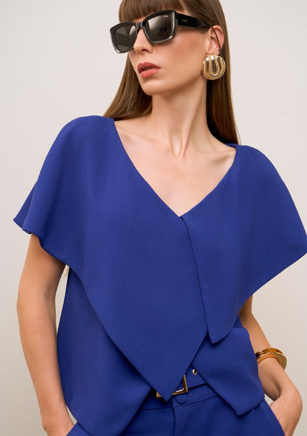 Blusa Iódice Ajustada Decote V Manga Curta Padrão Azul