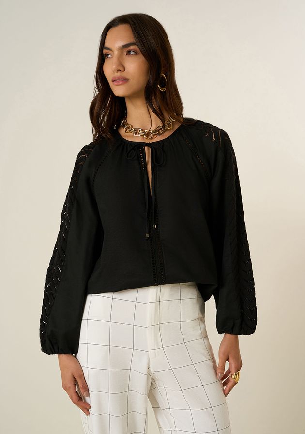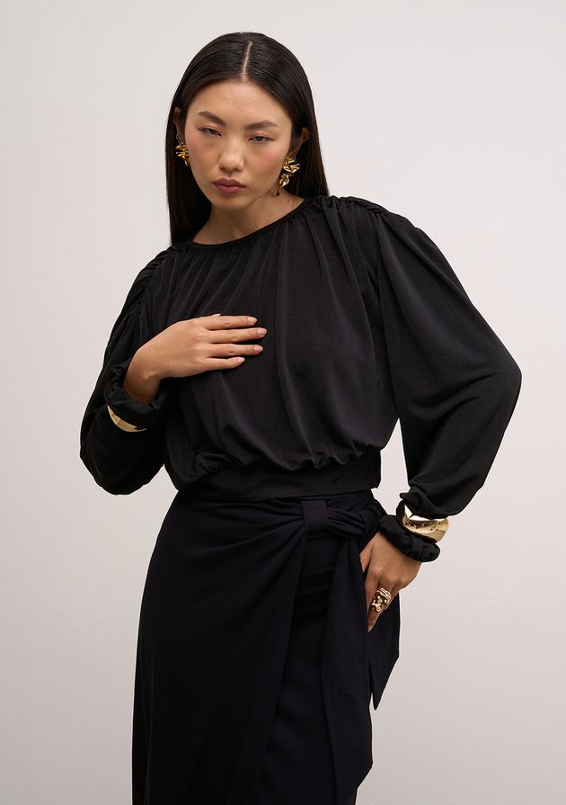 Blusa Iódice Solta Decote Careca Manga Longa Cropped Preto