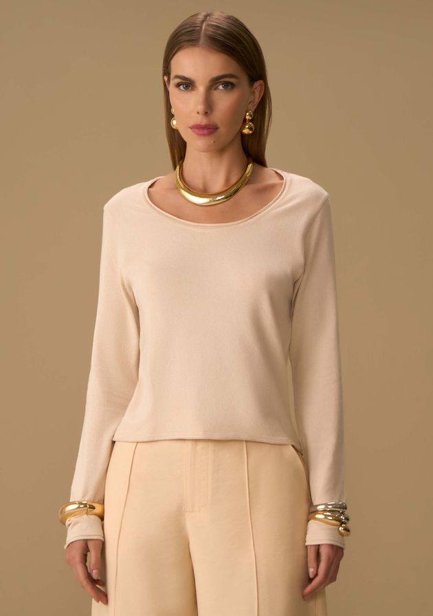 Blusa Maria.Valentina Ajustada Decote Canoa Manga Longa Padrão Bege