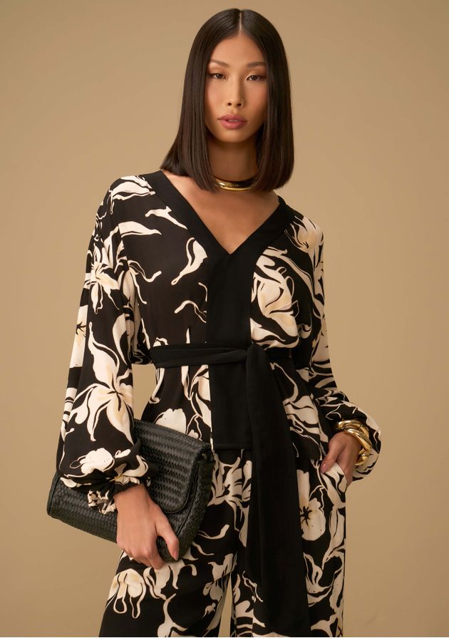 Blusa Iódice Solta Decote V Manga Longa Padrão Preto