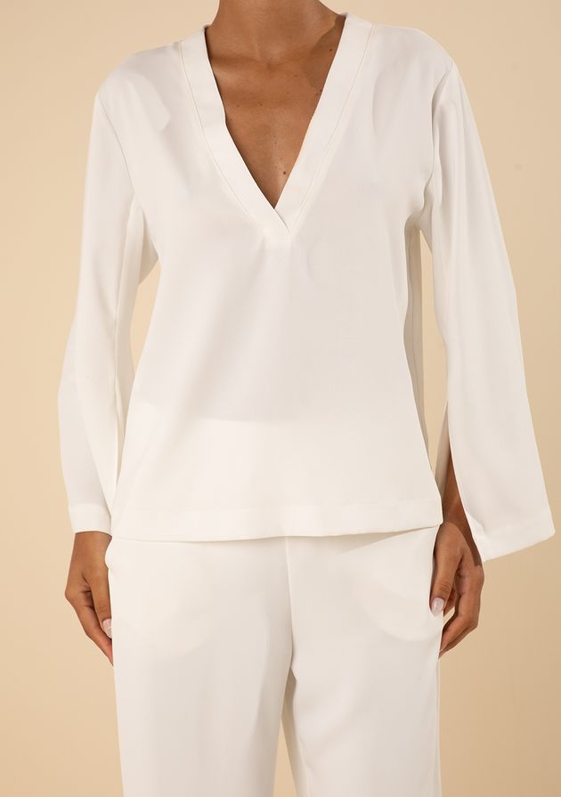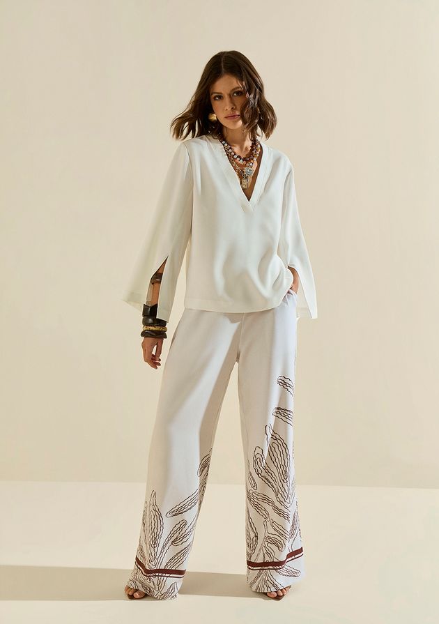 Blusa Morena Rosa Solta Decote V Manga 7 Oitavos Padrão Off White