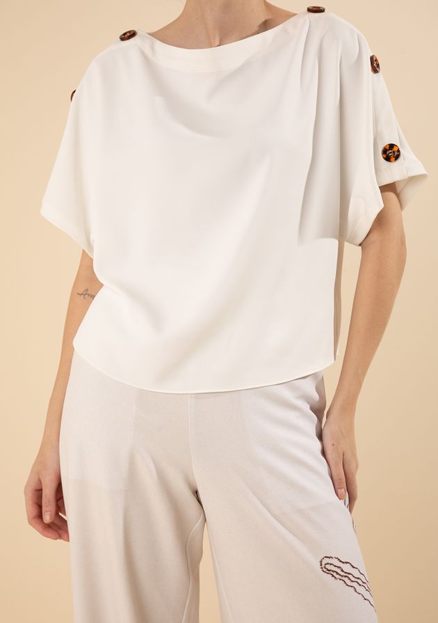 Blusa Morena Rosa Solta Decote Canoa Manga Curta Padrão Off White