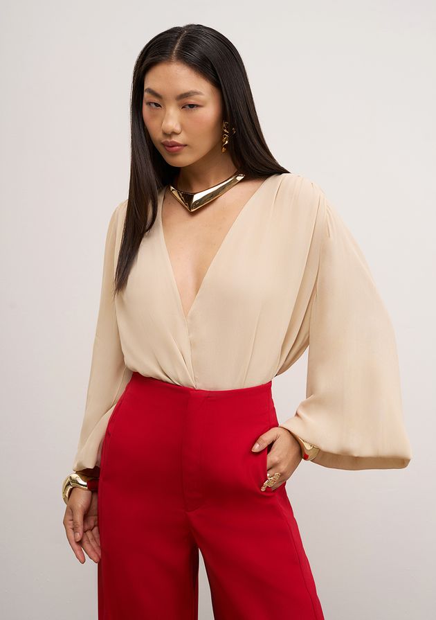 Body Iódice Decote V Manga Longa Bege