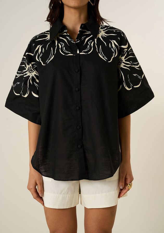 Camisa Maria.Valentina Solta Gola Clássica Manga Curta Alongada Preto