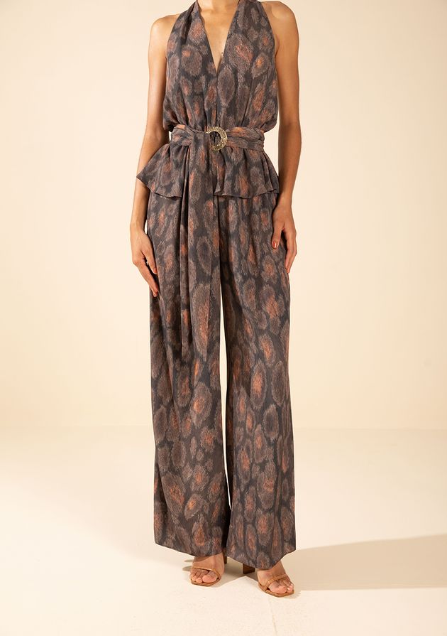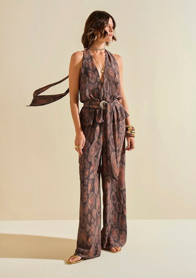 Macacão Morena Rosa Solto Decote V Sem Manga Longo Marrom