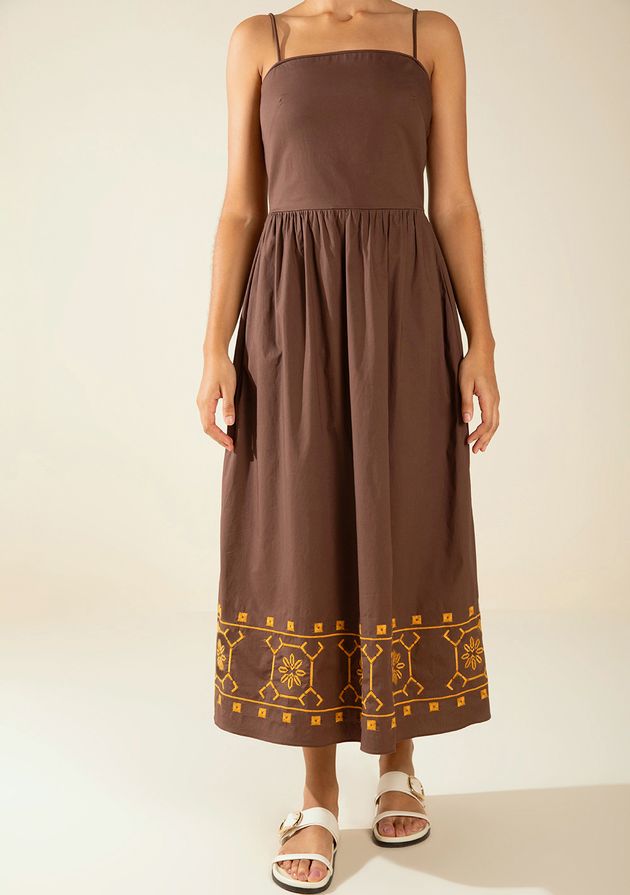 Vestido Morena Rosa Ajustado Decote Reto Com Alça Midi Marrom