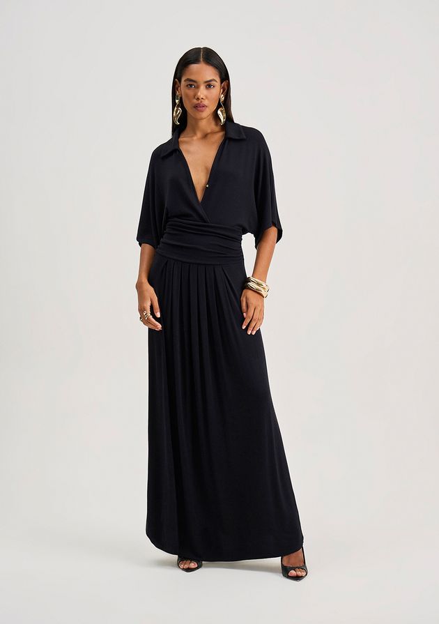 Vestido Iódice Ajustado Decote V Manga 3 Quartos Midi Preto