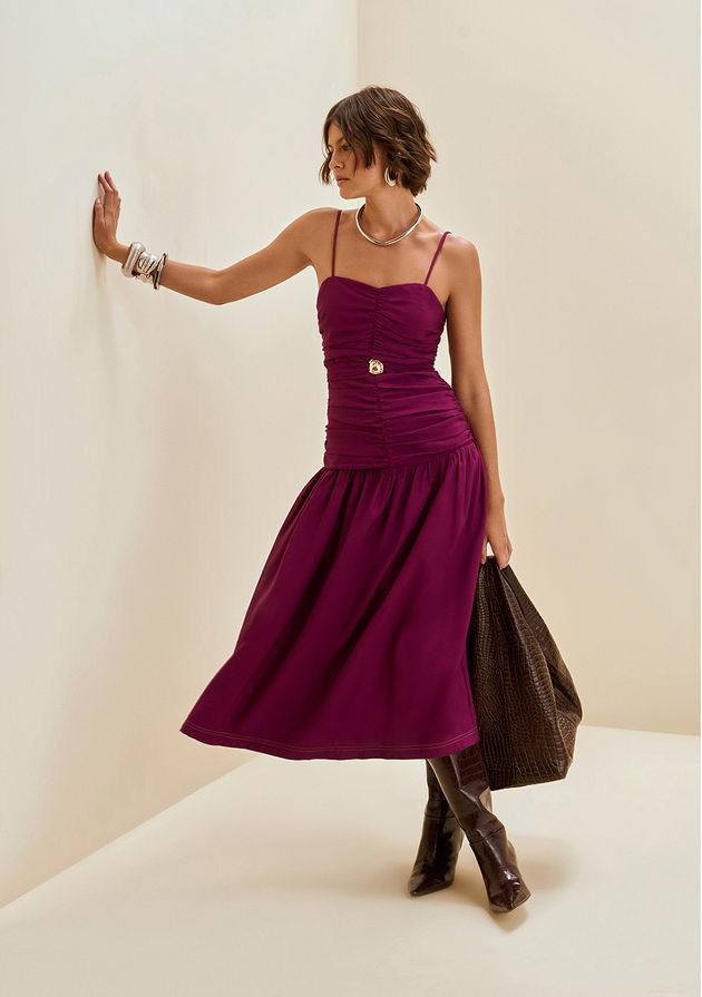 Vestido Morena Rosa Ajustado Decote Reto Com Alça Midi Roxo