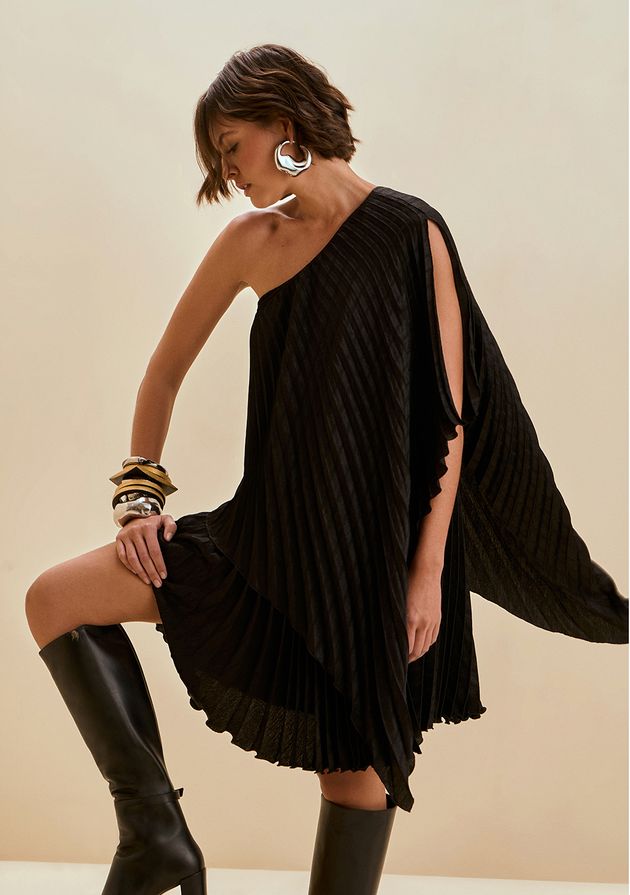 Vestido Morena Rosa Solto Um Ombro Só Manga Curta Curto Preto