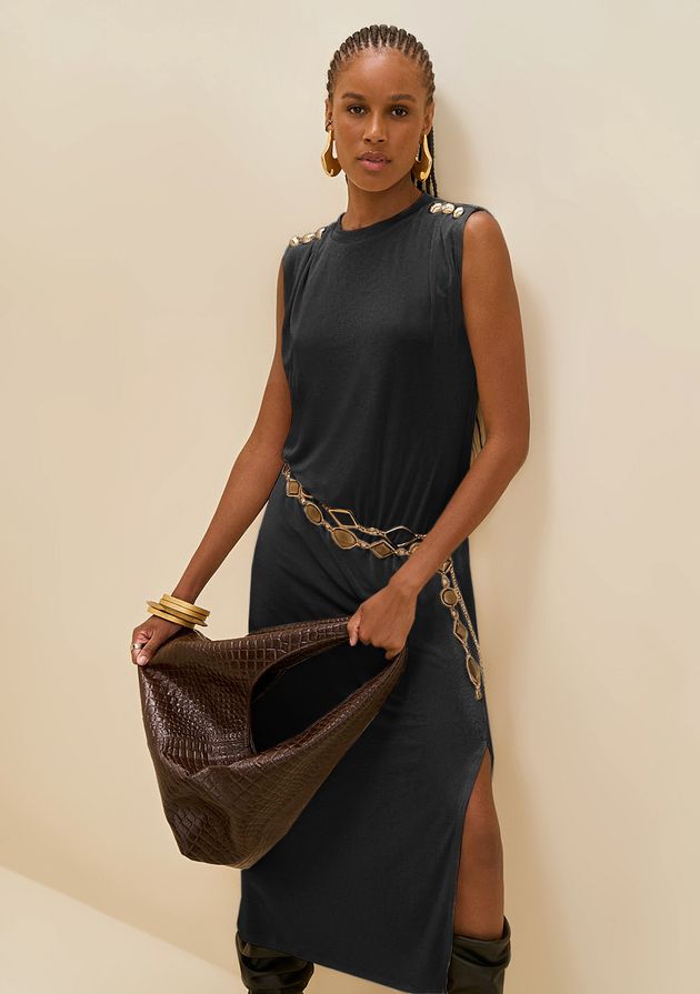 Vestido Morena Rosa Solto Decote Careca Sem Manga Midi Preto