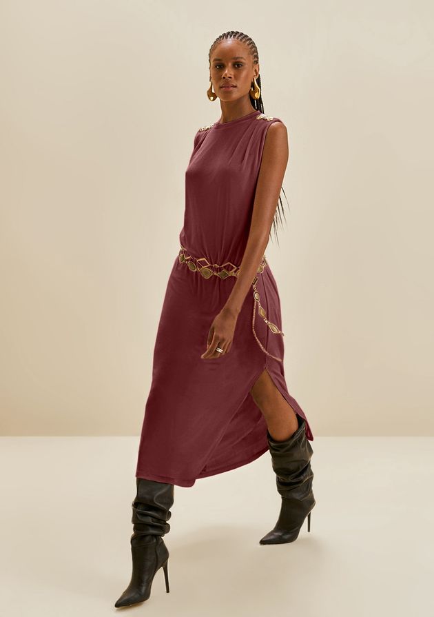 Vestido Morena Rosa Solto Decote Careca Sem Manga Midi Vermelho
