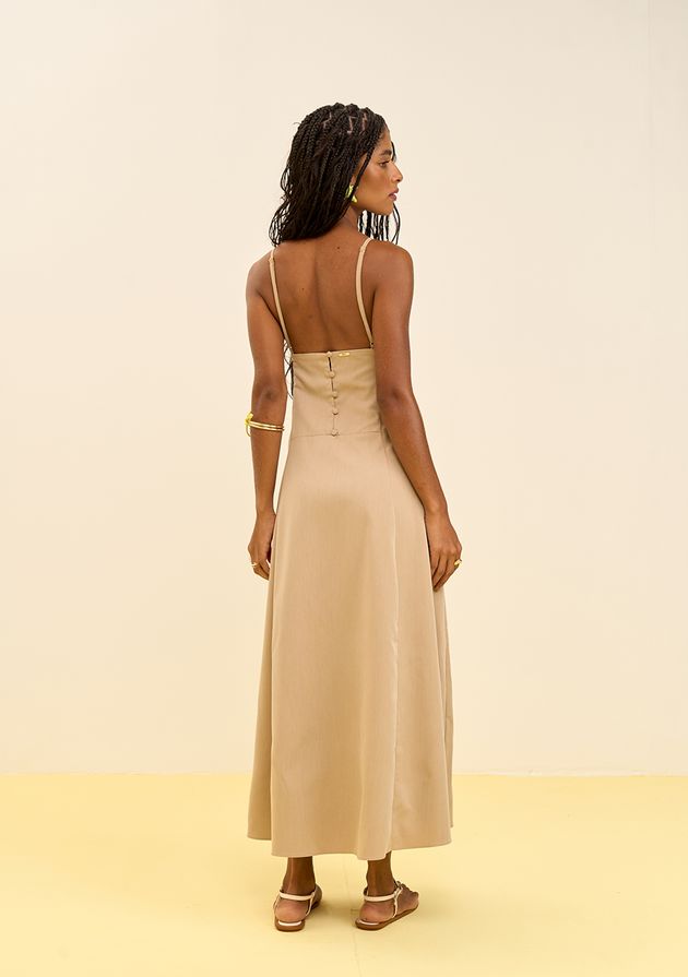 Vestido Zinco Solto Decote Reto Com Alça Longo Bege
